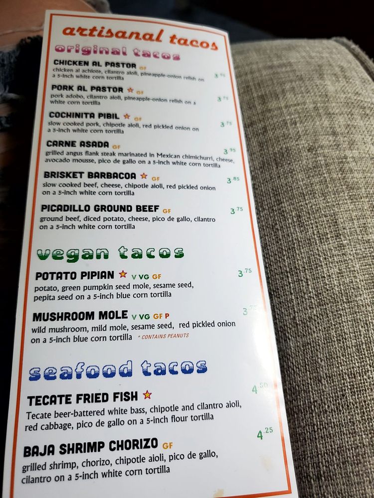 mushrooms, mild mole, sesame seed, red pickled onion, corn tortilla